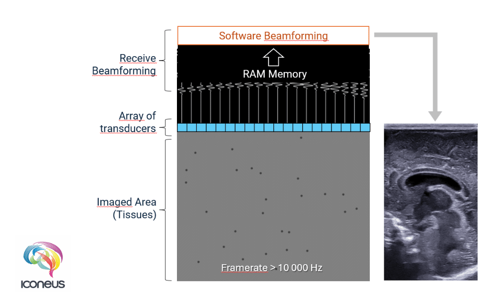 So, how can this trade-off be overcome? The solution, proposed in the late 1990s and developed in the succeeding years by a team involving Iconeus founder Mickael Tanter,1 is to fire all the transducers at once. That creates a ‘plane wave’, eliminating the time delay inherent in the transmit/receive pulse sequence, and making possible what is termed ‘ultrafast ultrasound’.